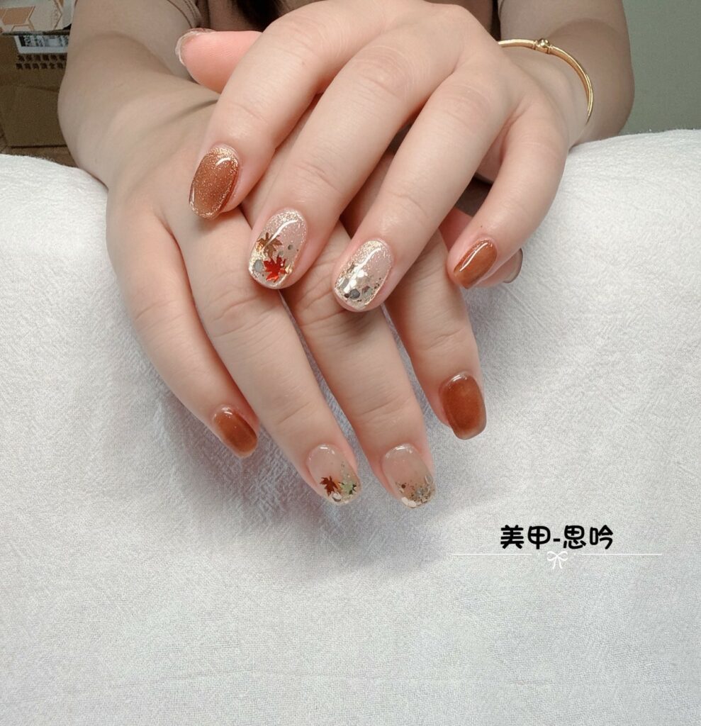 ▼橘棕色系搭配楓葉亮片,指尖呈現滿滿秋天感。
