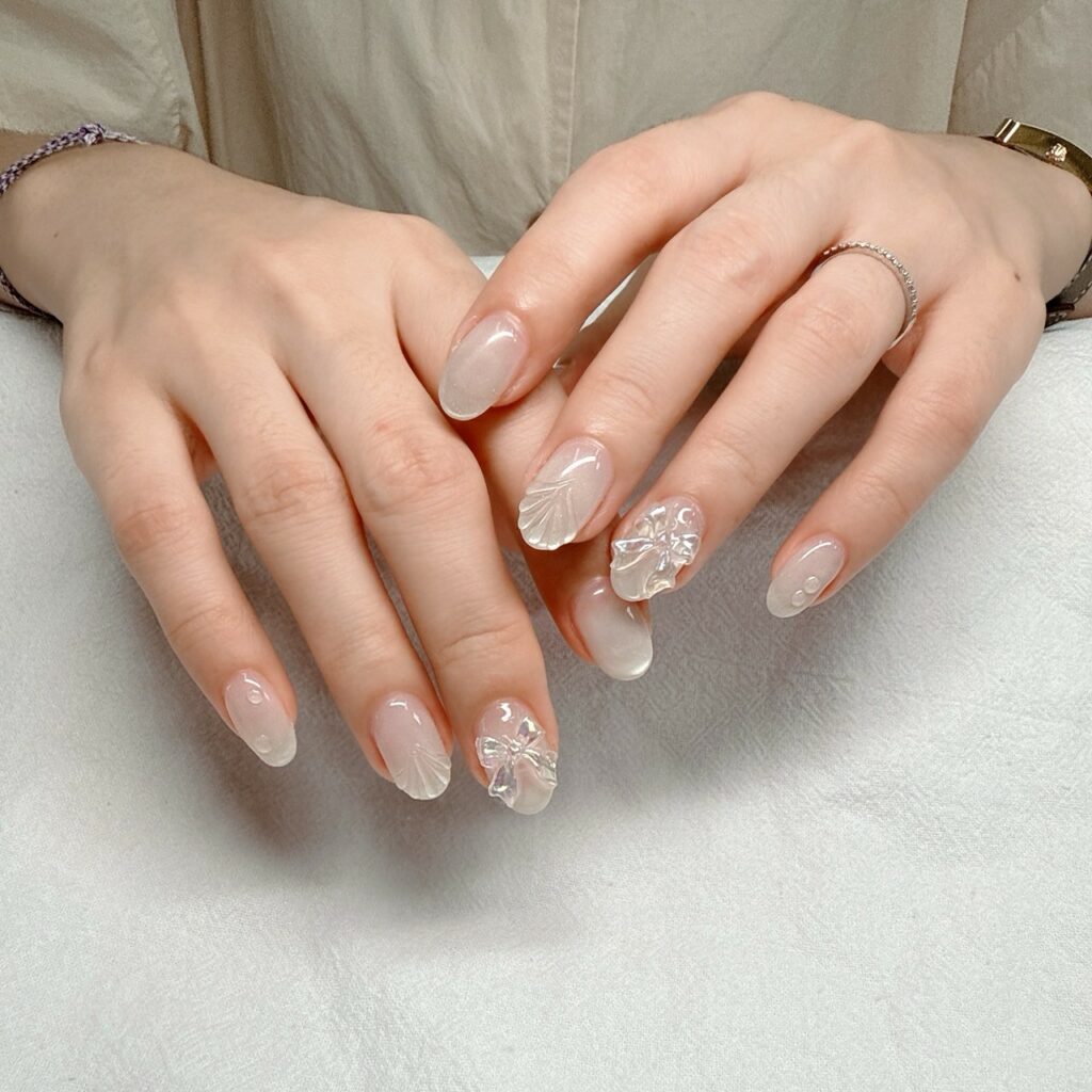 ▼純白水晶雕花立體蝴蝶,仙氣滿溢的乾淨系美甲。